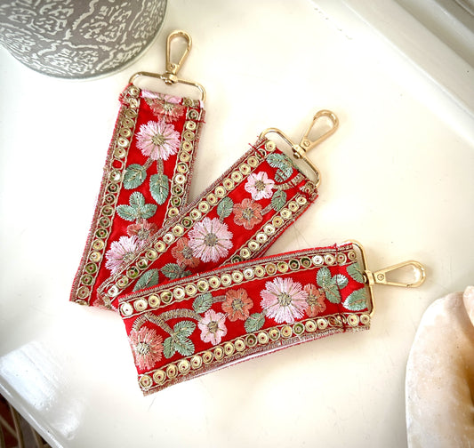 Red embroidered floral key chain/ bag charm
